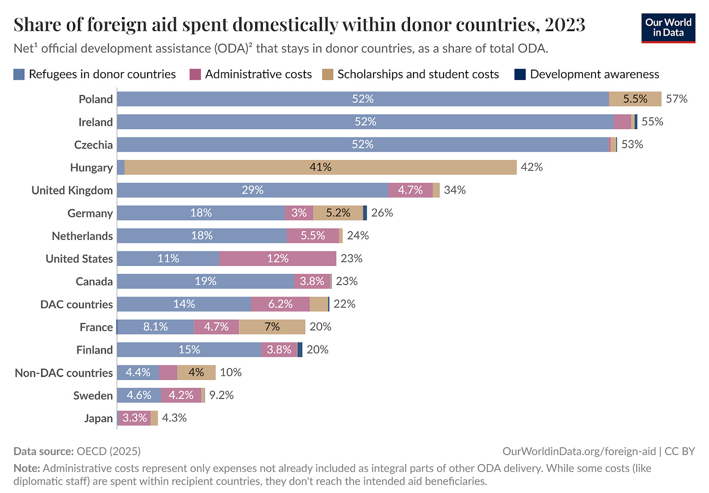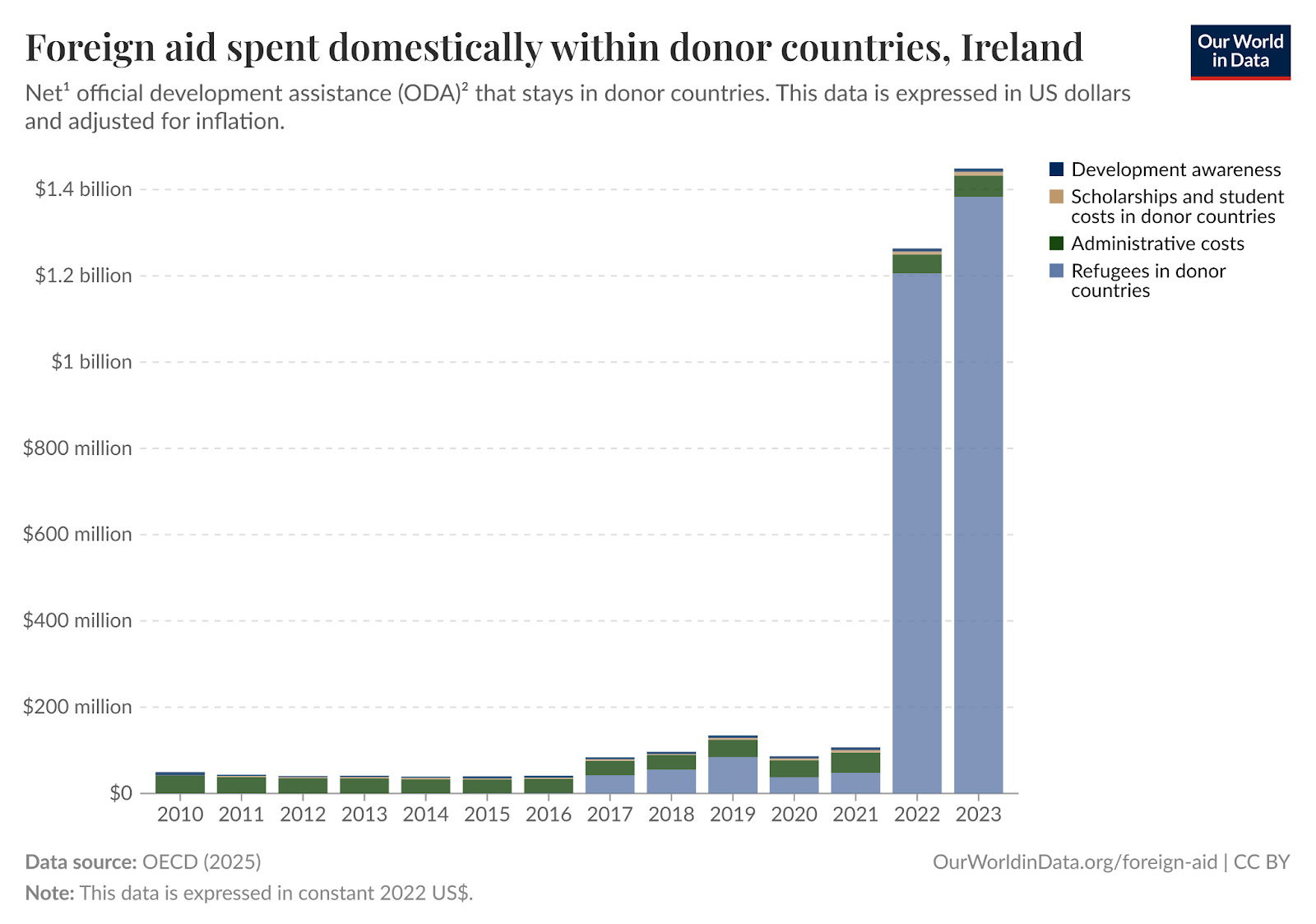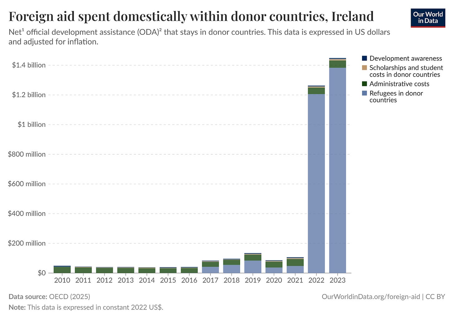 Ireland is in a weird spot relative to all of this. Over the last few years, with the war in Ukraine, the percentage of its aid budget that has been spent on refugees has skyrocketed. In terms of in-country ‘foreign aid’ spending, we are now second only to Poland.