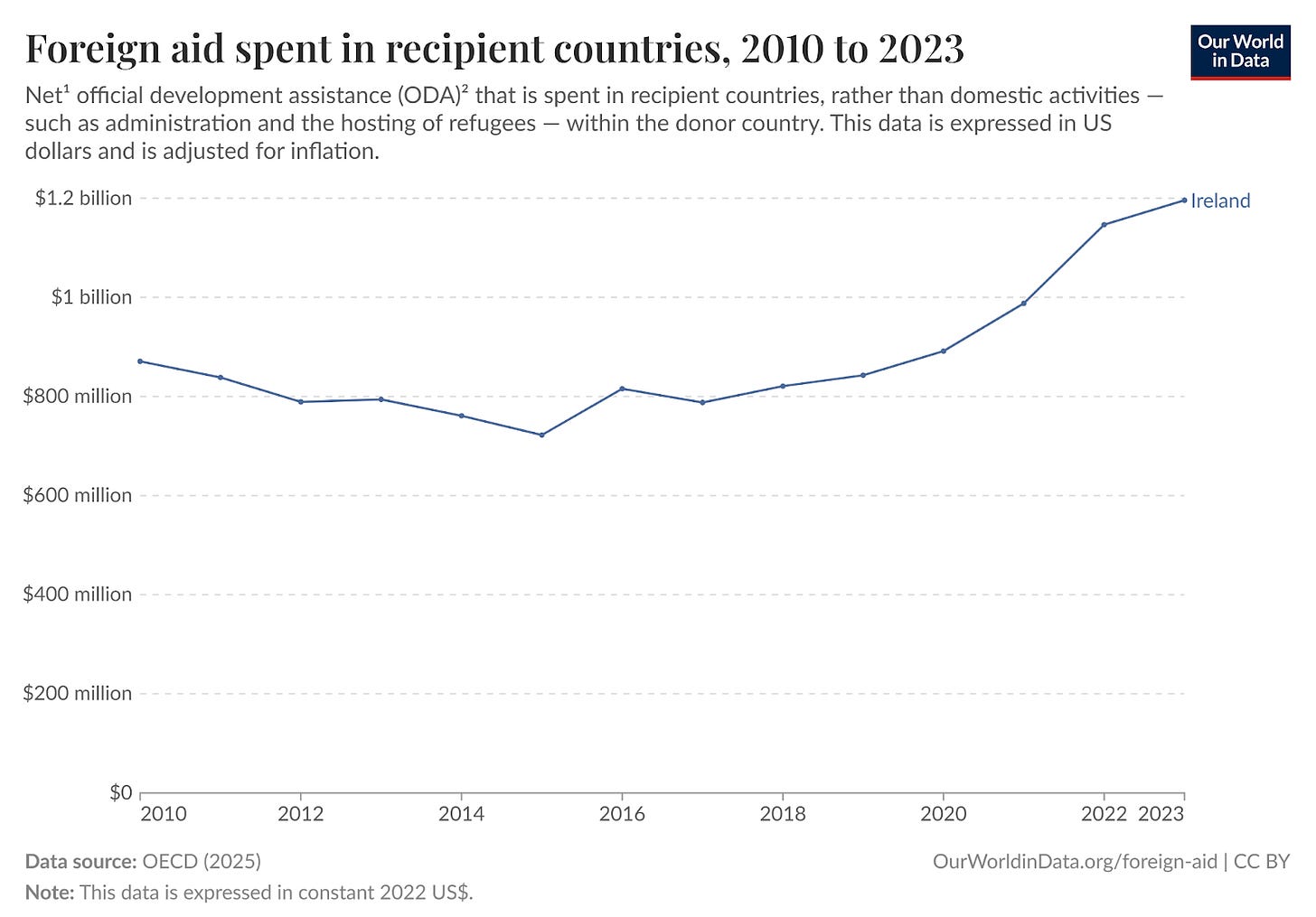 Ireland is, by some measures, among the most generous nations in the world in its foreign aid. In 2023, the government spent over US$500 per capita on ‘development assistance’, the standard metric for foreign aid spending. That’s nearly twice the figure from the UK, which spent only about $250 per head of population that year. It’s also well above average per capita spending among the Development Assistance Committee (the group of countries that are considered ‘major donors’ in foreign aid), which in 2023 was less than $200.1
